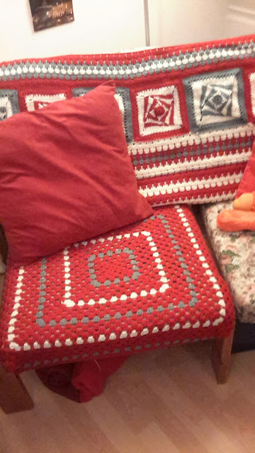 Een voornemen dat wel is doorgegaan is het opnieuw aankleden van mijn bankje. Een tijd terug had ik hier al delen voor gemaakt, deze heb ik eindelijk aan elkaar gezet. Helaas is een deel niet meer te bekleden, omdat er te weinig rode wol over is. Ik ben dus weer opzoek naar de steenrode kleur van de saskia wol van de Wibra. Ik hoor graag als iemand deze kleur tegenkomt.